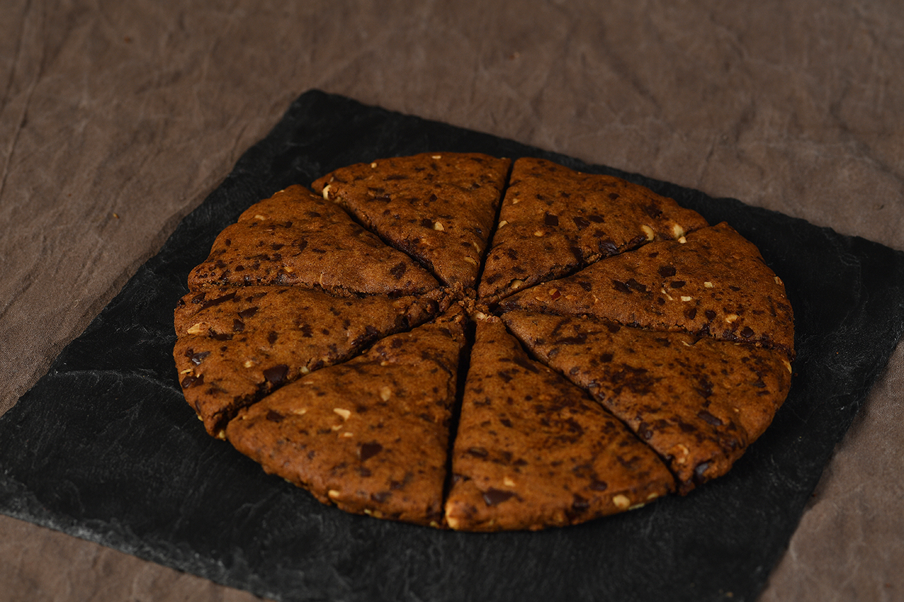 FARINE DE BLÉ T110 28%, BEURRE 21%, Chocolat noir 72% sans sucre 14% (Edulcorant (maltitol), beurre de cacao, cacao en poudre dégraissé, inuline, émulsifiant (lécithine de tournesol), arôme naturel de vanille ), sucre de coco, NOISETTES HACHÉES GRILLÉES 8,4%, OEUF, farine de pois chiche, levure, sel.